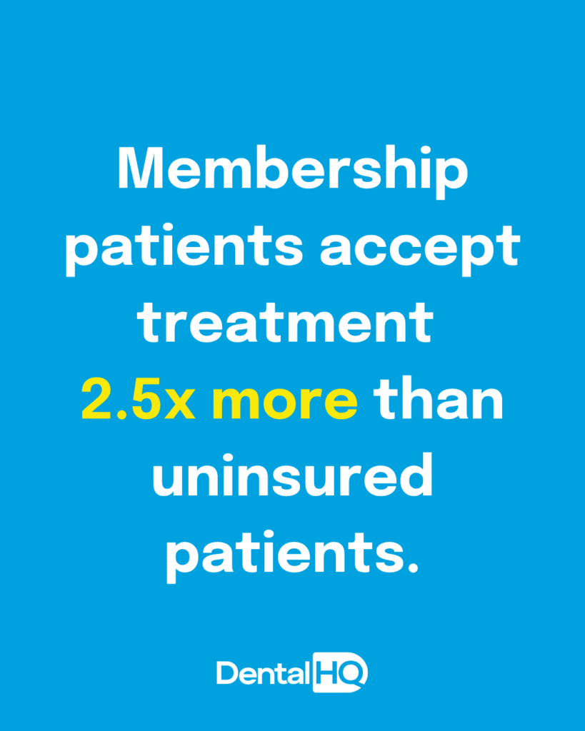 And the impact goes beyond just visits. In-house dental membership plan Membership patients accept treatment 2.5x more than uninsured patients, generating more revenue per year. They trust your office, see the value in their membership, and stay loyal for the long haul.